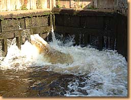 Wir schleusten aufwärts. In der Schleuse kam ein riesiger Schwall Wasser eingeflossen und wirbelte herum. Wir hatten die Schleuse gerade verlassen, da kam uns im recht engen Kanal ein etwas größeres Boot entgegen. Man konnte den Gesichtern der Besatzung ansehen, dass sie doch leichte Panik hatten, ob sie an uns vorbei passen würden. Wir warteten ab und ließen sie zuerst in die Schleuse einfahren.