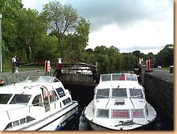 Der Shannon war schnell durchfahren und an der Abzweigung zum B&B-Kanal hatten wir ein Problem. Eigentlich war alles ganz normal ausgeschildert und wir fuhren auch nach den Zeichen, aber der Fluß hatte seinen Lauf so geändert, daß es aussah als ob wir falsch wären. Sofort wurde ein Notstop gemacht und erst mal alles in Augenschein genommen. Wir waren richtig, wenn auch der breitere Flußlauf nördlich einer kleinen Insel verlief. Beruhigt setzten wir unsere Fahrt fort. Nach kurzer Zeit erreichten wir Battlebridge Lock. Wir mußten einen Augenblick am Anleger festmachen und wer kam uns entgegen, aus der Schleuse heraus? Die Sunflower! Fröhlich wurde gegrüßt. Für die Männer der Sunflower war der Urlaub langsam zu Ende und sie mußten zurück, wir sollten sie nicht mehr treffen. Die Schleusenhöhe war beachtlich, wir mußten die Leinen ordentlich werfen, es klappte aber gut.